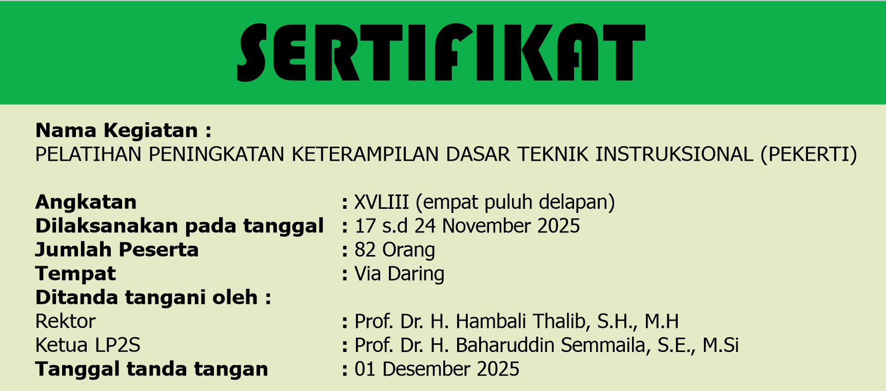 Makassar, umi.ac.id – Daftar Peserta Pelatihan Peningkatan Keterampilan Dasar Teknik Instruksional (Pekerti) Angkatan XLVIII sebagai berikut : (LP2S UMI)