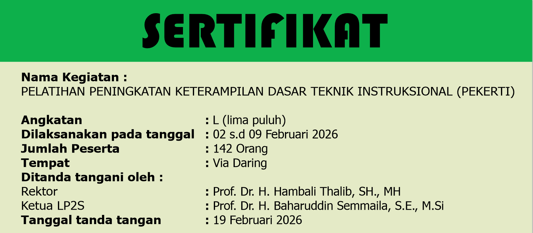 Makassar, umi.ac.id – Daftar Peserta Pelatihan Peningkatan Keterampilan Dasar Teknik Instruksional (Pekerti) Angkatan L (50) sebagai berikut : (LP2S)