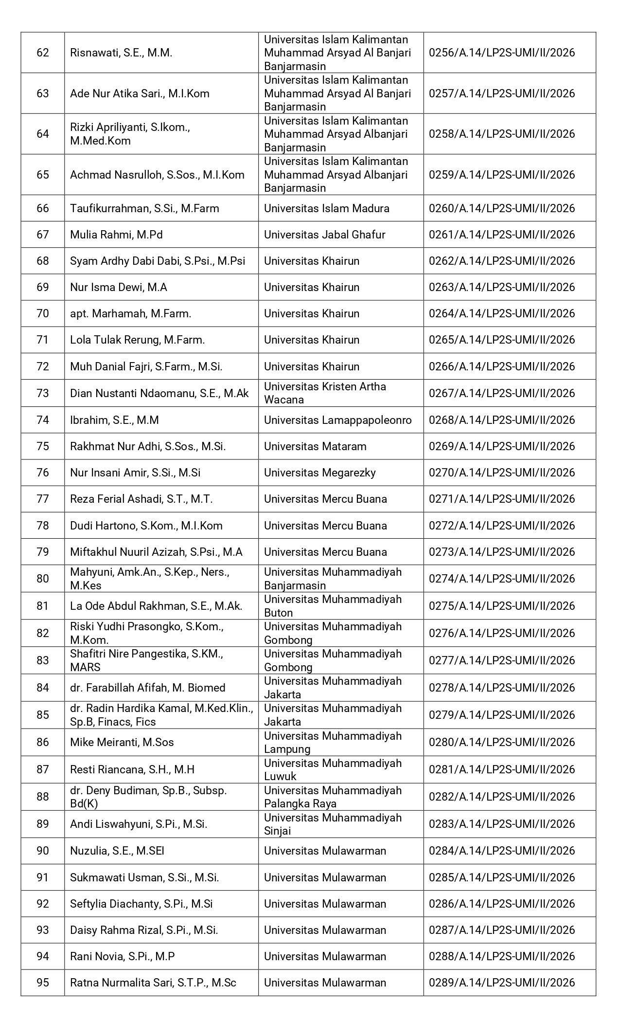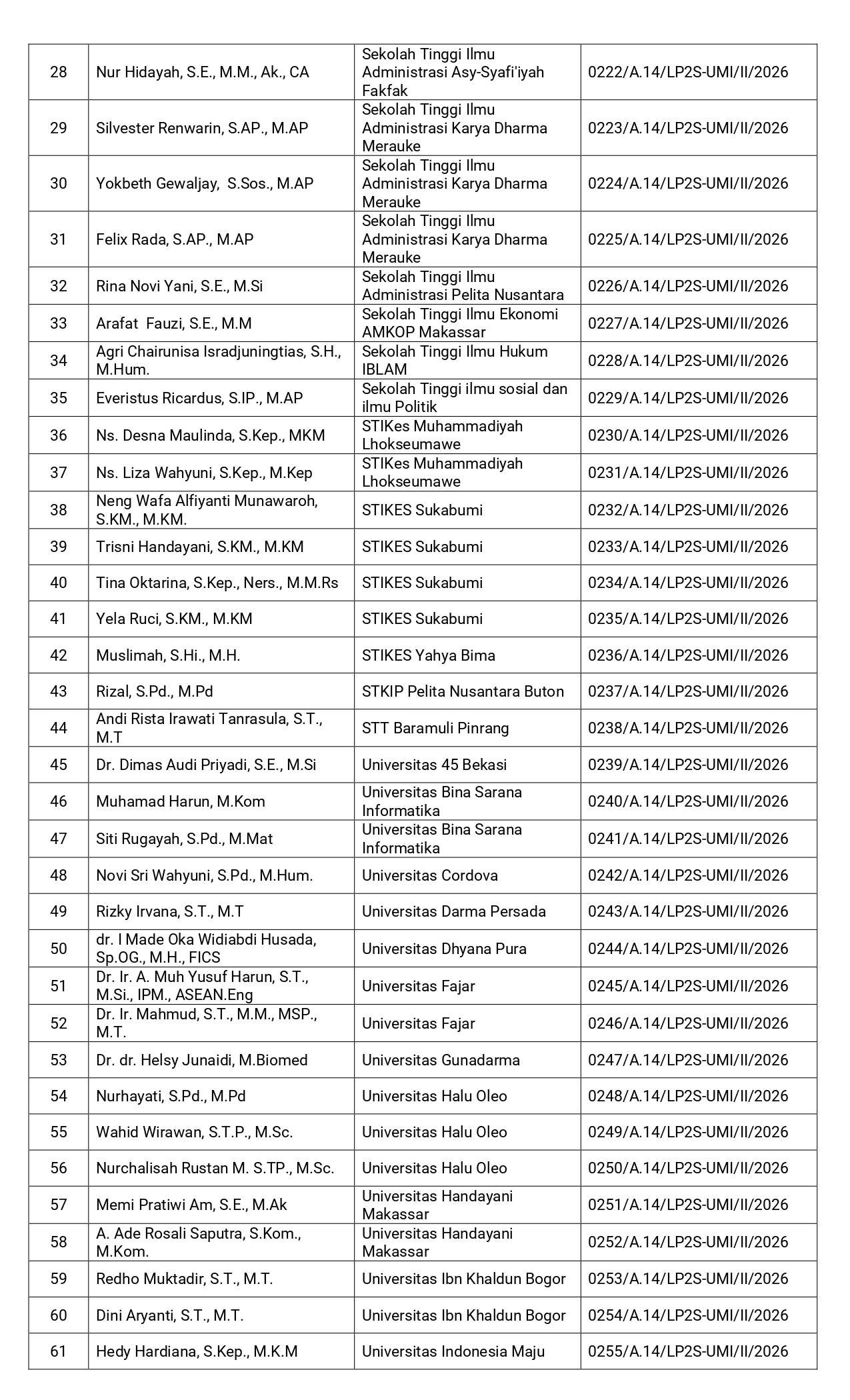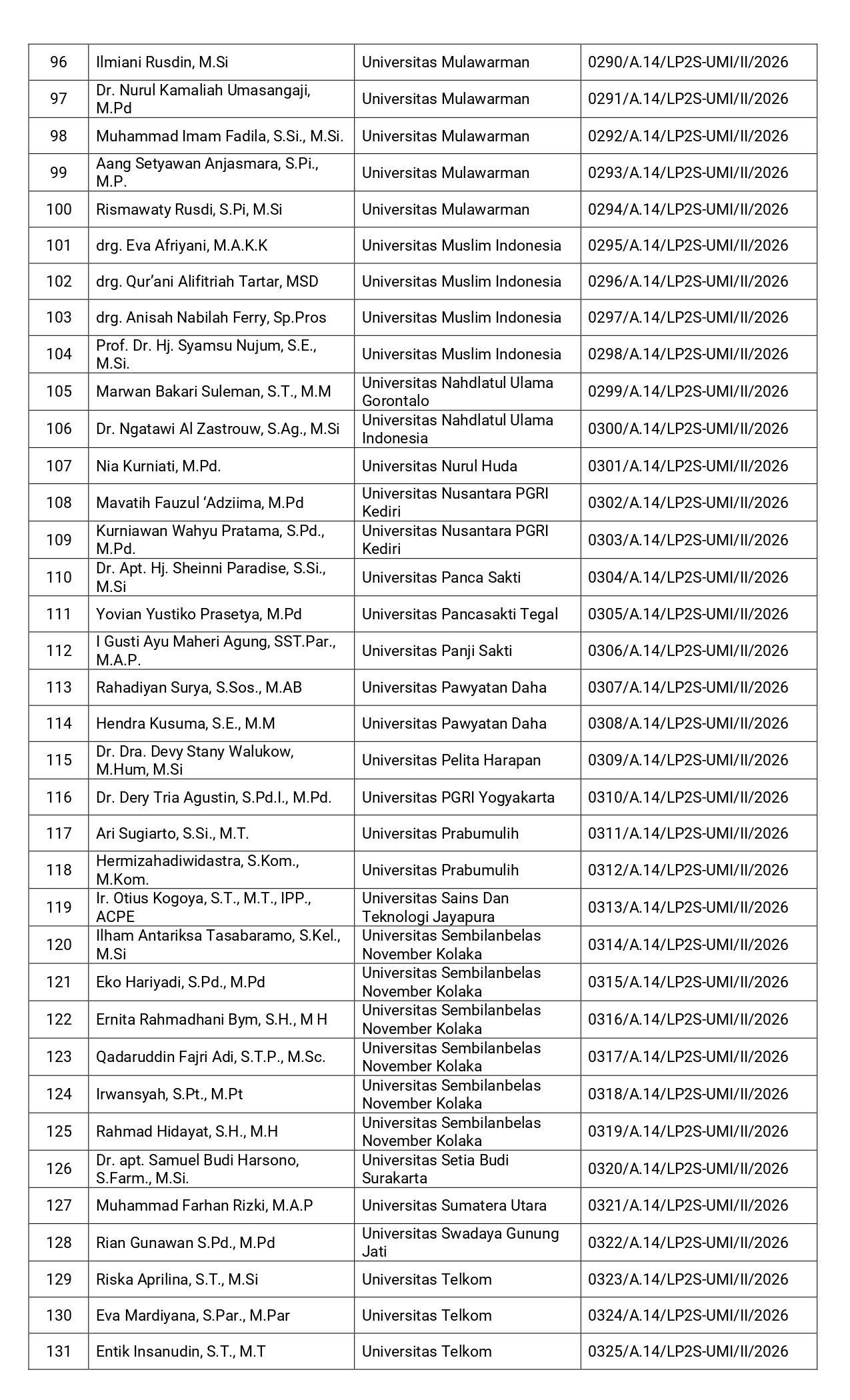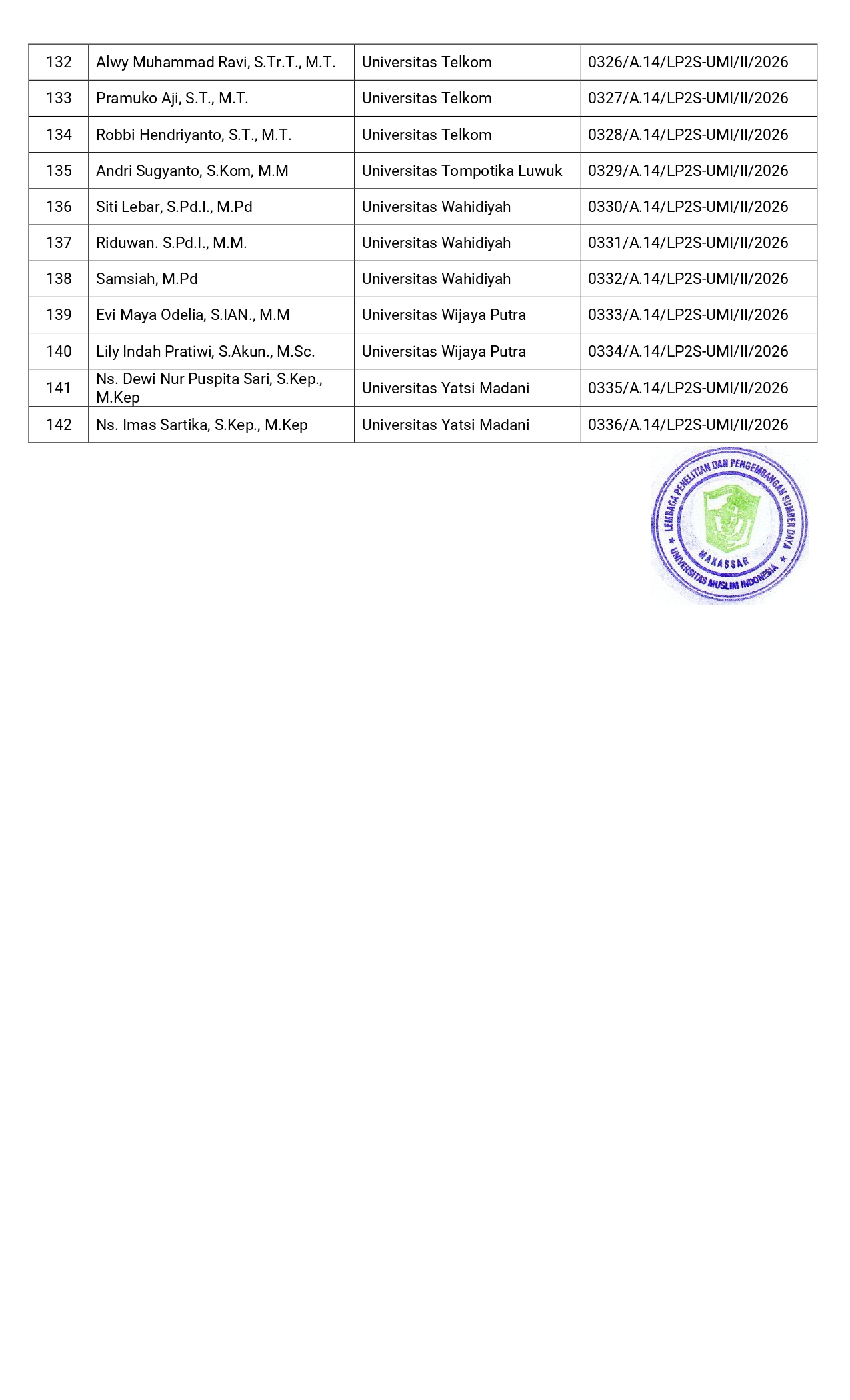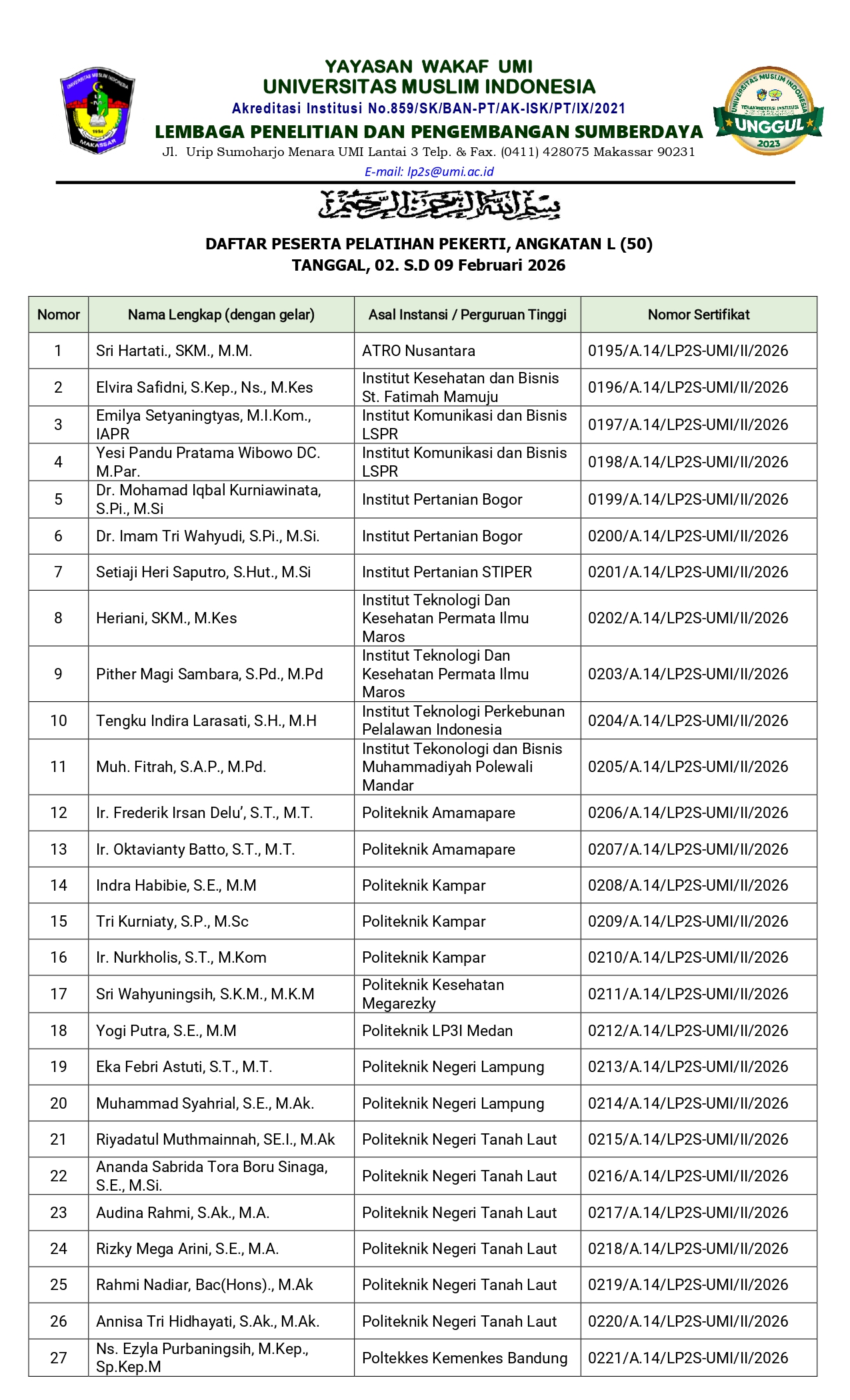 Makassar, umi.ac.id – Daftar Peserta Pelatihan Peningkatan Keterampilan Dasar Teknik Instruksional (Pekerti) Angkatan L (50) sebagai berikut :