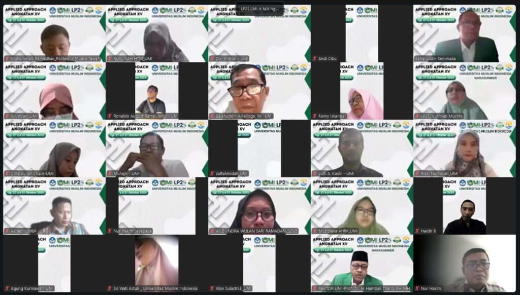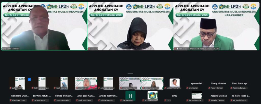 Makassar, umi.ac.id – Lembaga Penelitian dan Pengembangan Sumberdaya (LP2S) Universitas Muslim Indonesia (UMI) kembali menggelar Pelatihan Applied Approach (AA) secara daring Zoom Meeting, yang berlangsung pada tanggal 27 s.d 31 Oktober 2025.