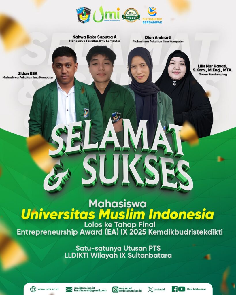 Makassar, umi.ac.id – Prestasi membanggakan kembali diraih oleh mahasiswa Universitas Muslim Indonesia (UMI). Salah satu tim mahasiswa UMI berhasil lolos ke tahap final Entrepreneurship Award (EA) IX Tahun 2025 yang diselenggarakan Kementerian Pendidikan, Kebudayaan, Riset, dan Teknologi (Kemdikbudristekdikti).
