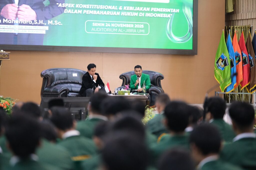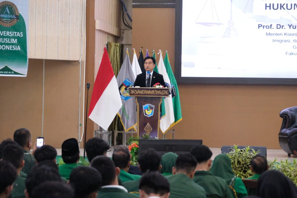 Hal tersebut digambarkan oleh Menteri Koordinator Bidang Hukum, Hak Asasi Manusia, Imigrasi, dan Pemasyarakatan Indonesia Prof. Dr. Yusril ihza Mahendra, SH, M.Sc, saat membawakan materi pada Kuliah Umum Fakultas Hukum (FH) Universitas Muslim Indonesia (UMI) di auditorium Al Jibra UMI, Jalan Urip Sumohardjo, Makassar, Senin (24/11/2025).