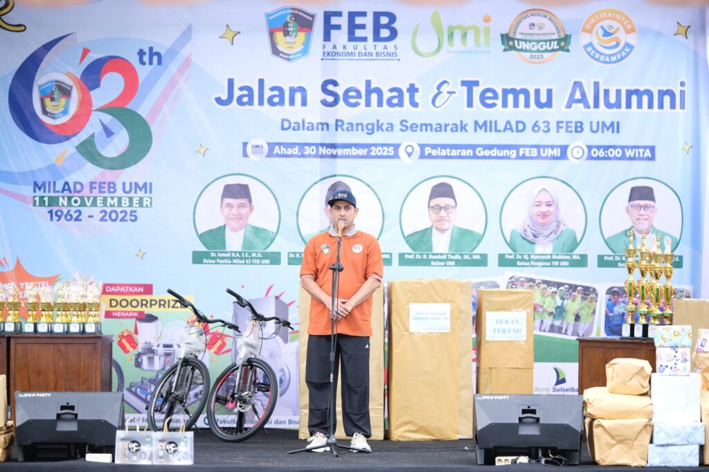 Makassar, umi.ac.id – Fakultas Ekonomi dan Bisnis (FEB) Universitas Muslim Indonesia (UMI) menyemarakkan milad ke 63 tahun dengan menggelar Jalan Sehat dan Temu Alumni pada hari Ahad (30/11/2025).