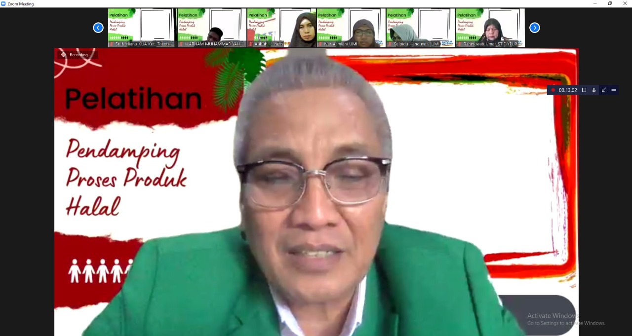 Makassar, umi.ac.id – UPT. Halal Center Universitas Muslim Indonesia (UMI) kerjasama Dinas Perindustrian Prov. Sulsel dan Dinas Perindustrian Kab/Kota se-Sulawesi Selatan menggelar Pelatihan Pendamping Proses Produk Halal secara virtual video conference zoom, yang berlangsung selama 3 Hari dimulai hari Rabu s.d Jum’at, tanggal 13 s.d 15 Juli 2022.